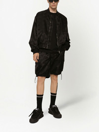 logo-tag satin bomber jacket Highlights - Monogram zip-up bomber jacket from dolce & gabbana featuring black, monogram print, band collar, front zip fastening, long sleeves, fitted-cuff sleeves, two front flap pockets and straight hem. Made in Italy Composition Nylon 100% Trims: Nylon 58%, Polyester 42%