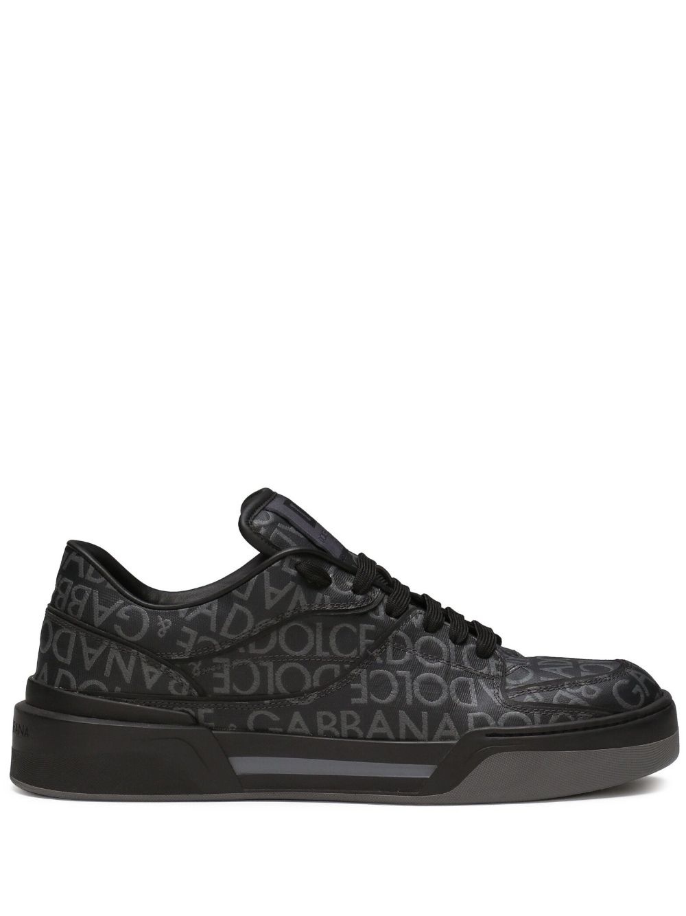 New Roma coated-jacquard sneakers Sporty and streetwear aesthetics inform the silhouette of Dolce & Gabbana's New Roma sneakers. The chunky silhouette appears here crafted in leather, and covered in a logo-print coated jacquard for a strong graphic branding. Highlights - Black - Leather - Coated finish - Jacquard logo motif - Logo patch at the tongue - Round toe - Front lace-up fastening - Flat rubber sole Made in Italy Composition Lining: Lambskin 80%, Goat Skin 20% Outer: Cotton 40%, Calf Leather 20%, Polyester 20%, Polyurethane 20% Sole: Rubber 100% SIZE & FIT Measurement HEEL 1.77 in(4.5 cm) Sole height 0.98 in(2.5 cm)