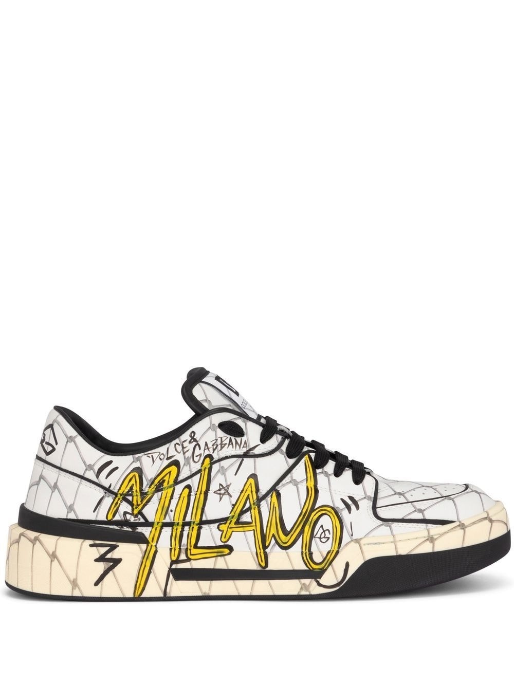 New Roma low-top sneakers A signature style of Dolce & Gabbana, the Roma sneakers are the embodiment of the brand's impeccable leatherwork thanks to their premium construction. This refreshing iteration showcases a graffiti print for SS23, continuing with the house's expertise. Made in Italy Composition Outer: Calf Leather 100% Lining: Lambskin 80%, Goat Skin 20% Sole: Rubber 100%