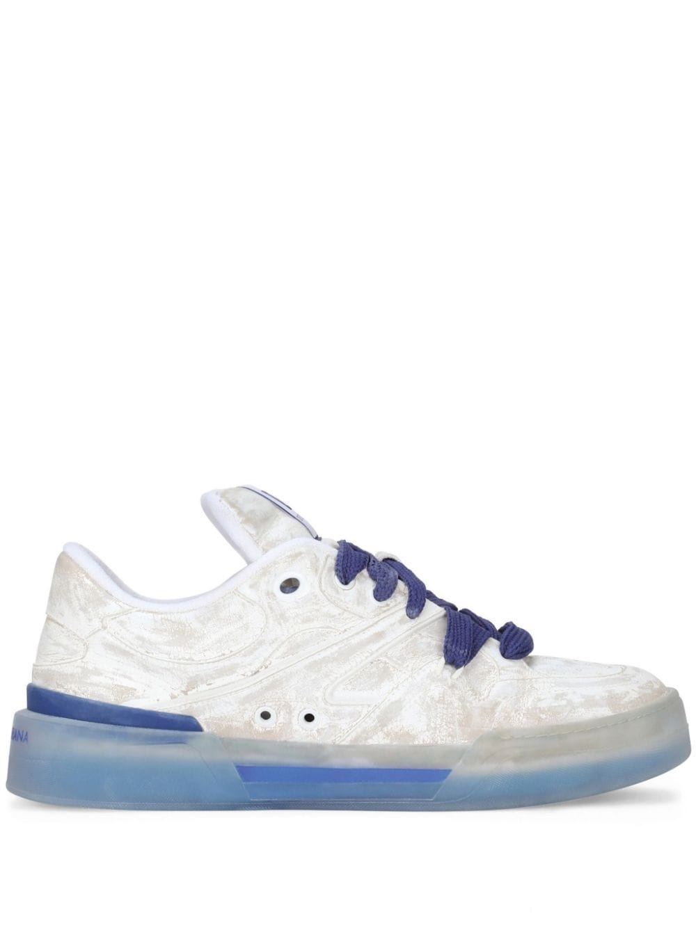 New Roma low-top sneakers Highlights - Blue/white - Calf leather - Panelled design - Abstract pattern print - Logo patch at the tongue - Logo print to the rear - Branded insole - Round toe - Front lace-up fastening - Flat rubber sole Made in Italy Composition Outer: Calf Leather 100% Lining: Polyester 70%, Lamb Skin 15%, Goat Skin 15% Sole: Rubber 100%