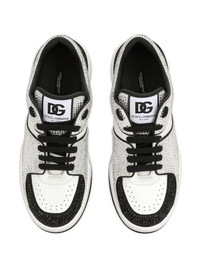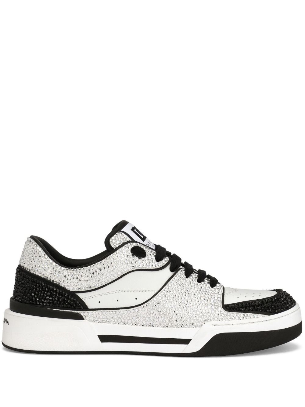 New Roma rhinestone-embellished sneakers Inspired by basketball styles, Dolce & Gabbana's New Roma sneakers are the result of the fusion between the brand’s iconic Roma and Miami sneakers. The panelled design is enhanced by the rhinestone embellishments. Highlights - White/black - Calf leather - Panelled design - Rhinestone embellishment - Perforated detailing - Logo patch at the tongue - Round toe - Front lace-up fastening - Branded insole - Flat rubber sole Made in Italy Composition Lining: Lambskin 80%, Goat Skin 20% Sole: Rubber 100% Outer: Calf Leather 100%