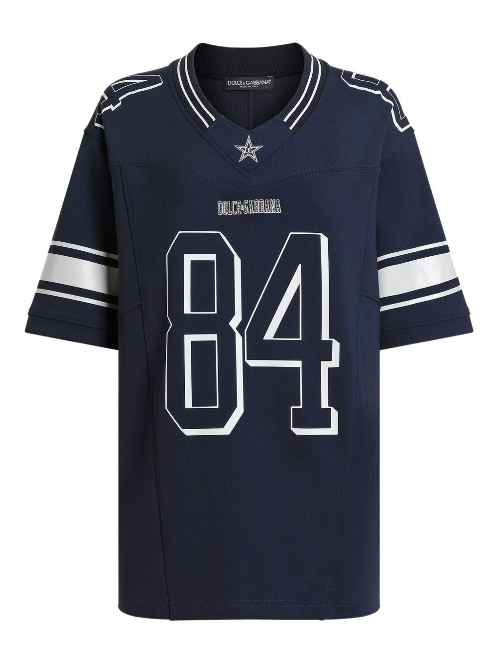 number 84 jersey Highlights - Navy blue - Short sleeves - V-neck - Stripe detail - Star emblem Made in Italy Composition Polyamide 90%, Elastane 10% Washing instructions Read Manufacturer Guidelines
