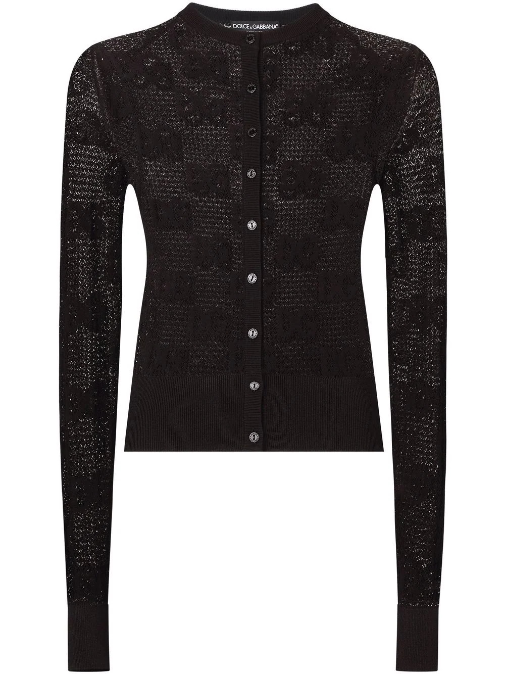 DG-logo lace-stitch cardigan Highlights - Black - Open-work - Jacquard logo motif - Round neck - Ribbed cuffs - Ribbed hem - Front button fastening - Long sleeves Made in Italy Composition Outer: Rayon 96%, Polyester 4% SIZE & FIT Measurement SLEEVE LENGTH 25.98 in(66 cm) LENGTH 22.04 in(56 cm)