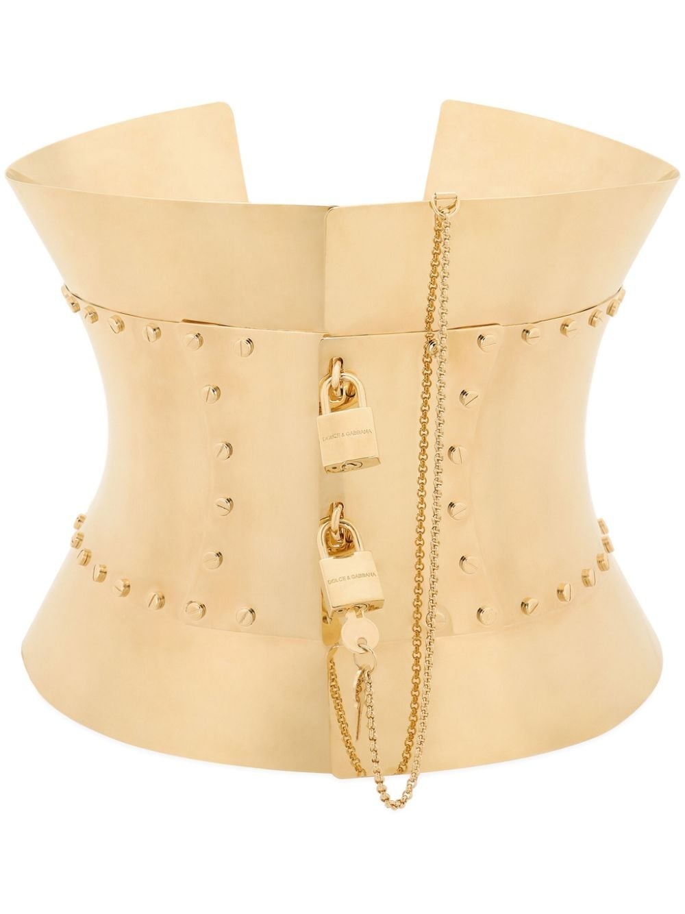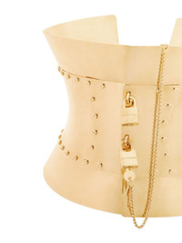 padlocks corset belt Highlights - Gold-tone - Brass - Corset style - Hourglass shape - Padlock detail - Rear leather strap fastening Made in Italy Composition Brass 95%, Calf Leather 5% SIZE & FIT Measurement WIDTH 8.66 in(22 cm)