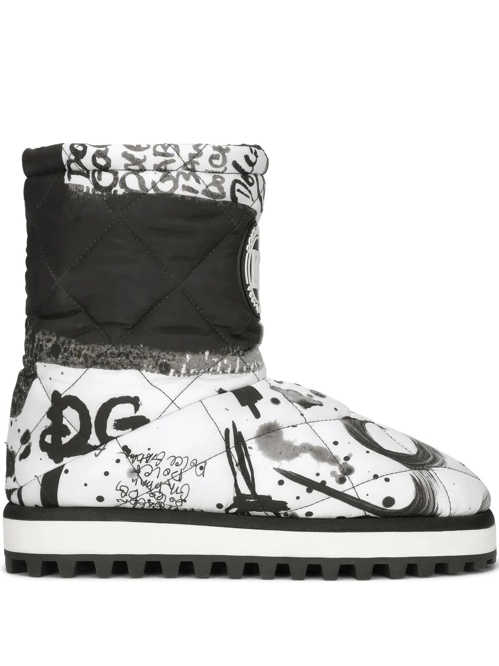 paint splatter-print padded boots black/white padded design paint splatter detail logo print to the front ankle-length pull-on style Made in Italy Composition Lining: Polyester 60%, Nylon 19%, Goat Skin 10%, Polyurethane 4%, Rayon 4%, Spandex/Elastane 3% Outer: Polyester 100% Sole: Rubber 100%