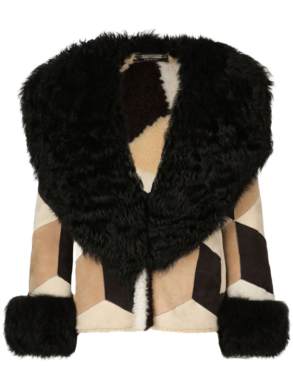 Short heavy jacket in sheepskin patchwork