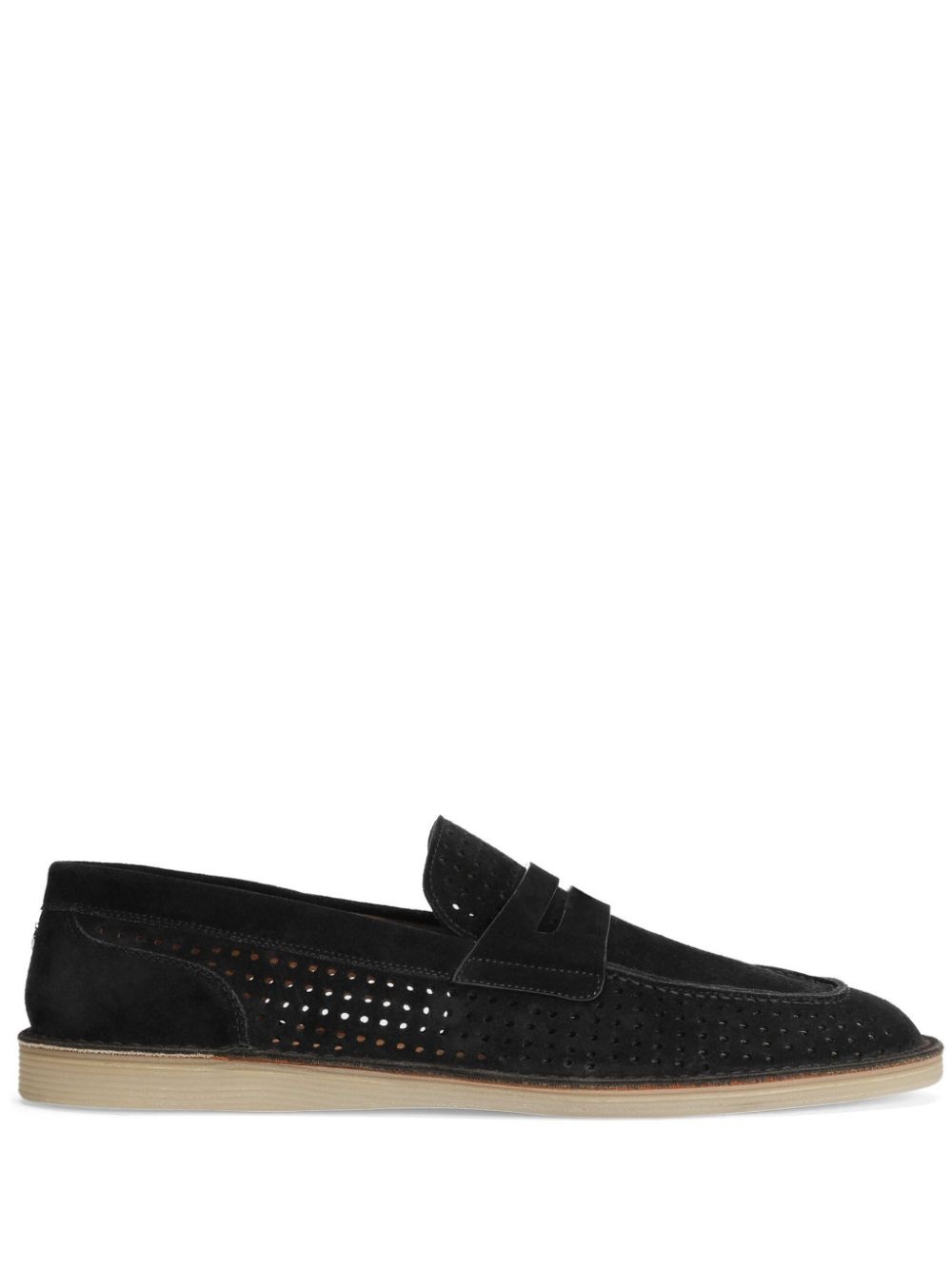 perforated loafers Highlights - Black - Penny slot - Logo plaque - Rubber sole Made in Italy Composition Sole: Rubber 100% Outer: Calf Suede 100% Lining: Calf Leather 90%, Goat Skin 10%
