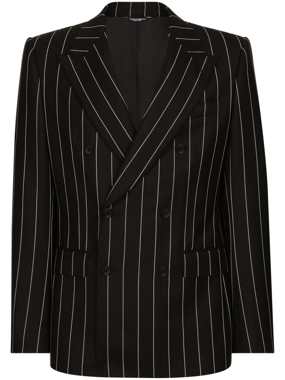 pinstripe-pattern wool blazer Highlights - Black - Virgin wool - Pinstripe pattern - Peak lapels - Shoulder pads - Chest welt pocket - Double-breasted button fastening - Long sleeves - Two front flap pockets - Straight hem Made in Italy Composition Virgin Wool 100% Washing instructions Read Manufacturer Guidelines