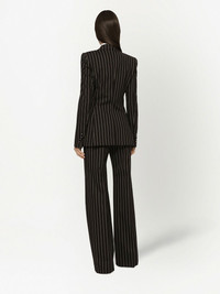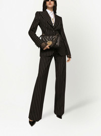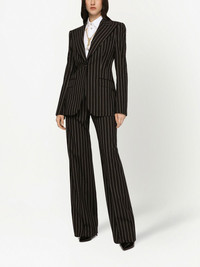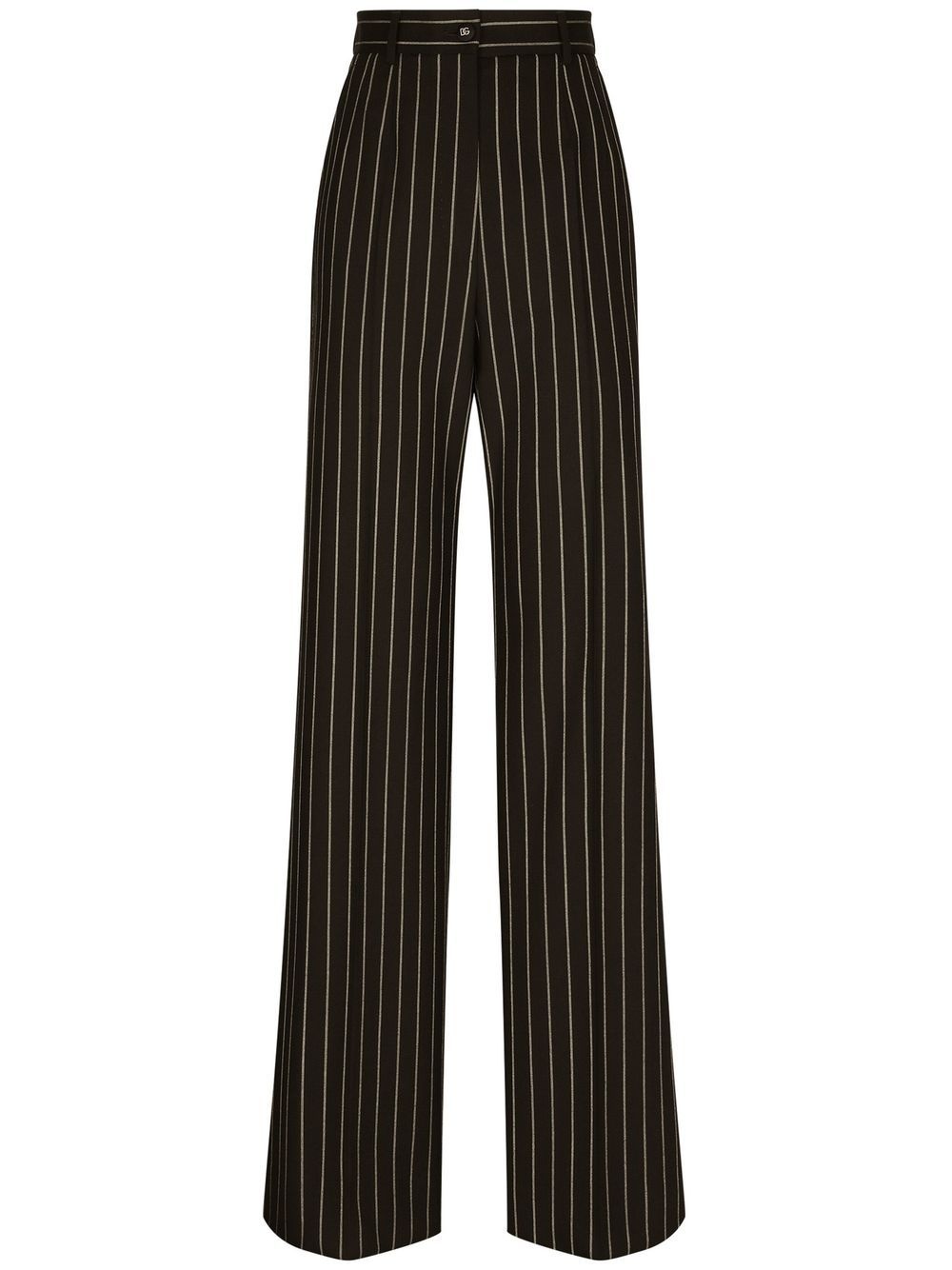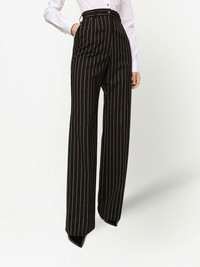 pinstriped wide-leg trousers A signature house code of Dolce & Gabbana is the pinstripe pattern. An Italian house staple that they identified with from the very beginning back in 1985. These wide-leg trousers boast a black and white pinstripe and high-waisted silhouette for an elongated look. Highlights - Black/white - Virgin wool blend - Pinstripe pattern - High-waisted - Button fly fastening - Belt loops - Logo-embossed button - Two side slash pockets - Wide leg Made in Italy Composition Virgin Wool 93%, Polyester 5%, Spandex/Elastane 2% SIZE & FIT Measurement FRONT RISE 13.18 in(33.5 cm) INSIDE LEG 35.82 in(91 cm) HIPS 44.88 in(114 cm) WAIST 32.28 in(82 cm)