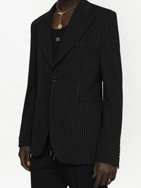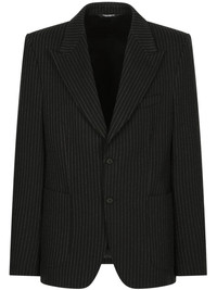 pinstriped single-breasted blazer Crafted from pinstriped stretch jersey fabric, Dolce & Gabbana showcases their timeless tailoring style with this single-breasted blazer. The piece is completed by exaggerated peak labels, offering a bold touch to the tailored style. Made in Italy Composition Outer: Rayon 47%, Nylon 31%, Polyester 16%, Spandex/Elastane 6% Lining: Rayon 100%