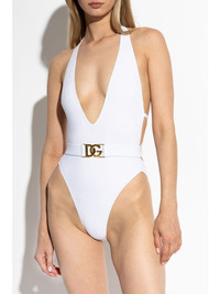 plunge-neck belted swimsuit Highlights - White - Stretch-design - Gold-tone logo plaque - Plunging v-neck - Logo-clasp fastening halterneck - Open back - Strap detailing - Belted waist - High cut - Be mindful to try on swimwear over your own garments. Made in Italy Composition Outer: Polyester 75%, Spandex/Elastane 25% Lining: Polyamide 80%, Spandex/Elastane 20% Washing instructions Read Manufacturer Guidelines