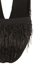 logo-tag fringed swimsuit Highlights - Black - Stretch-design - Sequin detailing - Fringe detailing - Gold-tone logo plaque - Halterneck tie fastening - Plunging v-neck - Adjustable spaghetti straps - Pull-on style - Be mindful to try on swimwear over your own garments. Made in Italy Composition Lining: Nylon 80%, Elastane 20% Outer: Nylon 75%, Spandex/Elastane 25%