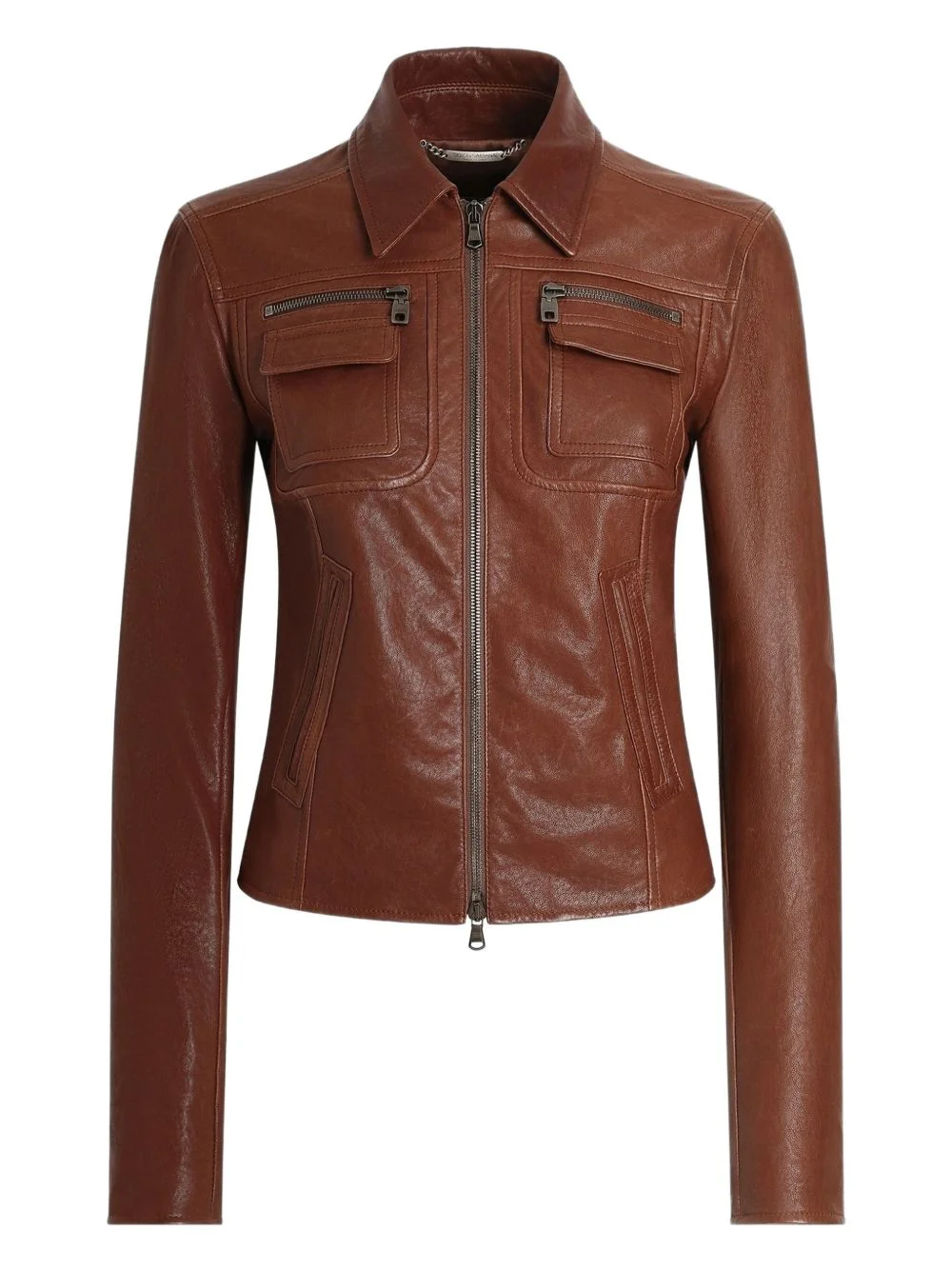 pocket zip-fastening leather jacket Highlights - Brown - Zip detail - Chest pockets - Point collar - Front zip fastening - Long sleeves Made in Italy Composition Outer: Sheepskin 100% Lining: Silk 100% Washing instructions Specialist Cleaning