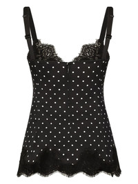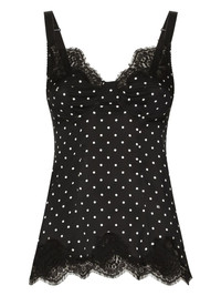 polka dot-print lace top Highlights - Black/white - Stretch-silk - Satin weave - Polka dot print - Lace trim - Sweetheart neck - Adjustable shoulder straps - Underwire cup - Concealed rear zip fastening - Unlined - Scallop hem Made in Italy Composition Outer: Silk 76%, Cotton 16%, Nylon 4%, Elastane 4% Lining: Silk 92%, Elastane 8% SIZE & FIT FittingInformation Designed for a close fit throughout