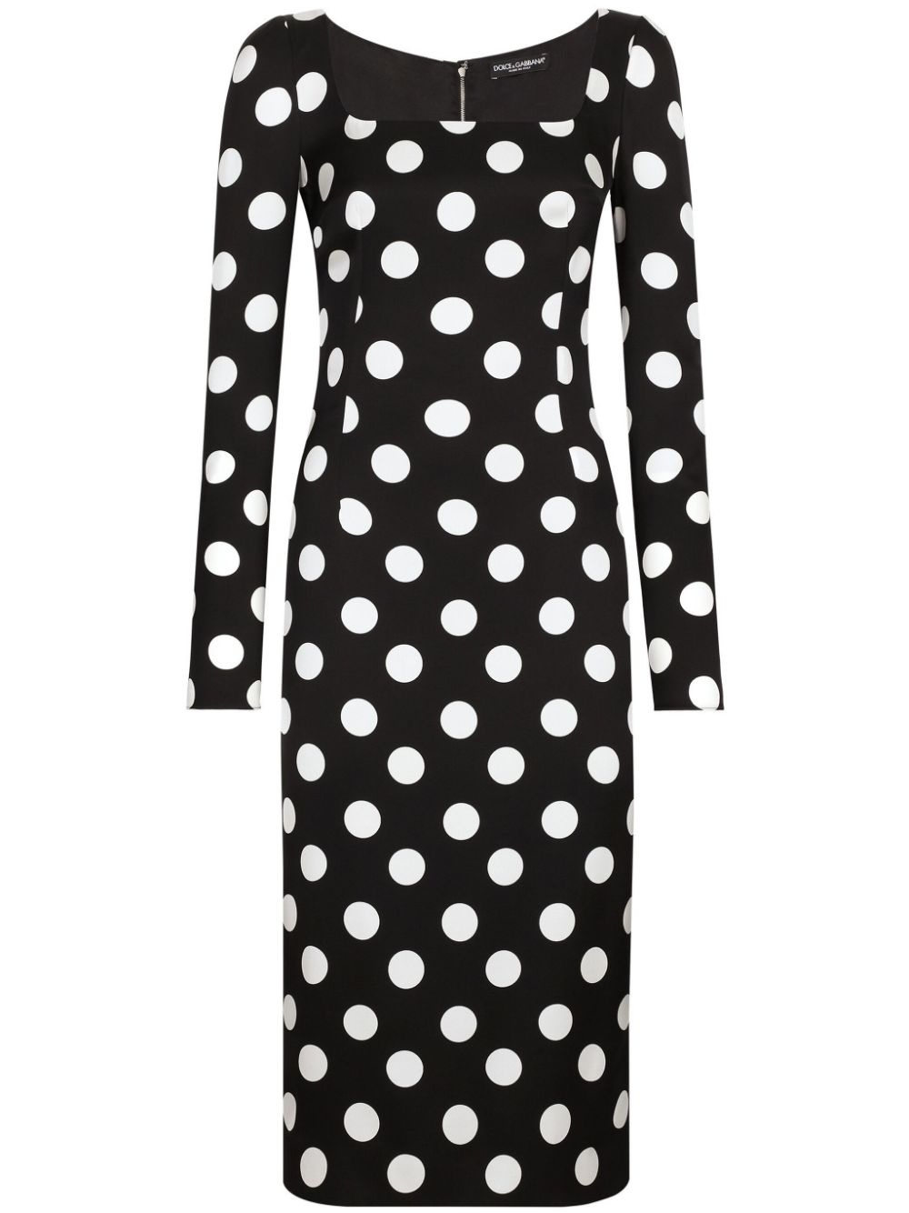 polka dot-print midi dress Dolce & Gabbana's dress takes notes from Hollywood glamour. It is made from black stretch silk to a sheath silhouette and embellished with a macro polka dot print for a dramatic look. Highlights - Black/white - Stretch-silk - Charmeuse - Polka dot print - Sheath silhouette - Square neck - Long sleeves - Straight hem - Rear slit - Below-knee length Made In Italy Composition Silk 91%, Elastane 9% Washing instructions Read Manufacturer Guidelines