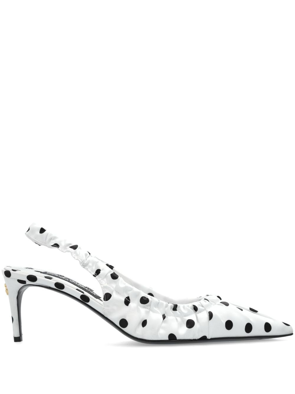 polka dot-print slingback pumps Highlights - White/black - Calf leather - Satin finish - Polka dot print - Pointed toe - Gold-tone logo plaque - Elasticated slingback strap - Branded leather insole - Kitten heel Made in Italy Composition Outer: Polyester 100% Lining: Calf Leather 100%, Fabric 100% Sole: Calf Leather 100%