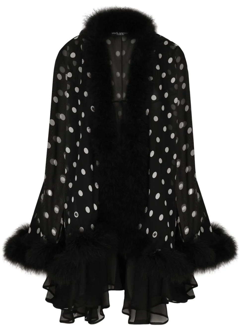 polka-dot silk cape Highlights - Black/white - Silk - Polka dot print - Marabou trim - Open front - Long sleeves - Asymmetric hem - This item comes from our partner boutiques in a variety of countries and cannot be shipped outside its region (either us, uae, or the eu & uk). please check the country of origin in the shipping & free returns tab or your shopping bag to make sure it can be delivered to your location. Made in Italy Composition Silk 100% SIZE & FIT FittingInformation Designed to be unstructured, offering a loose fit throughout