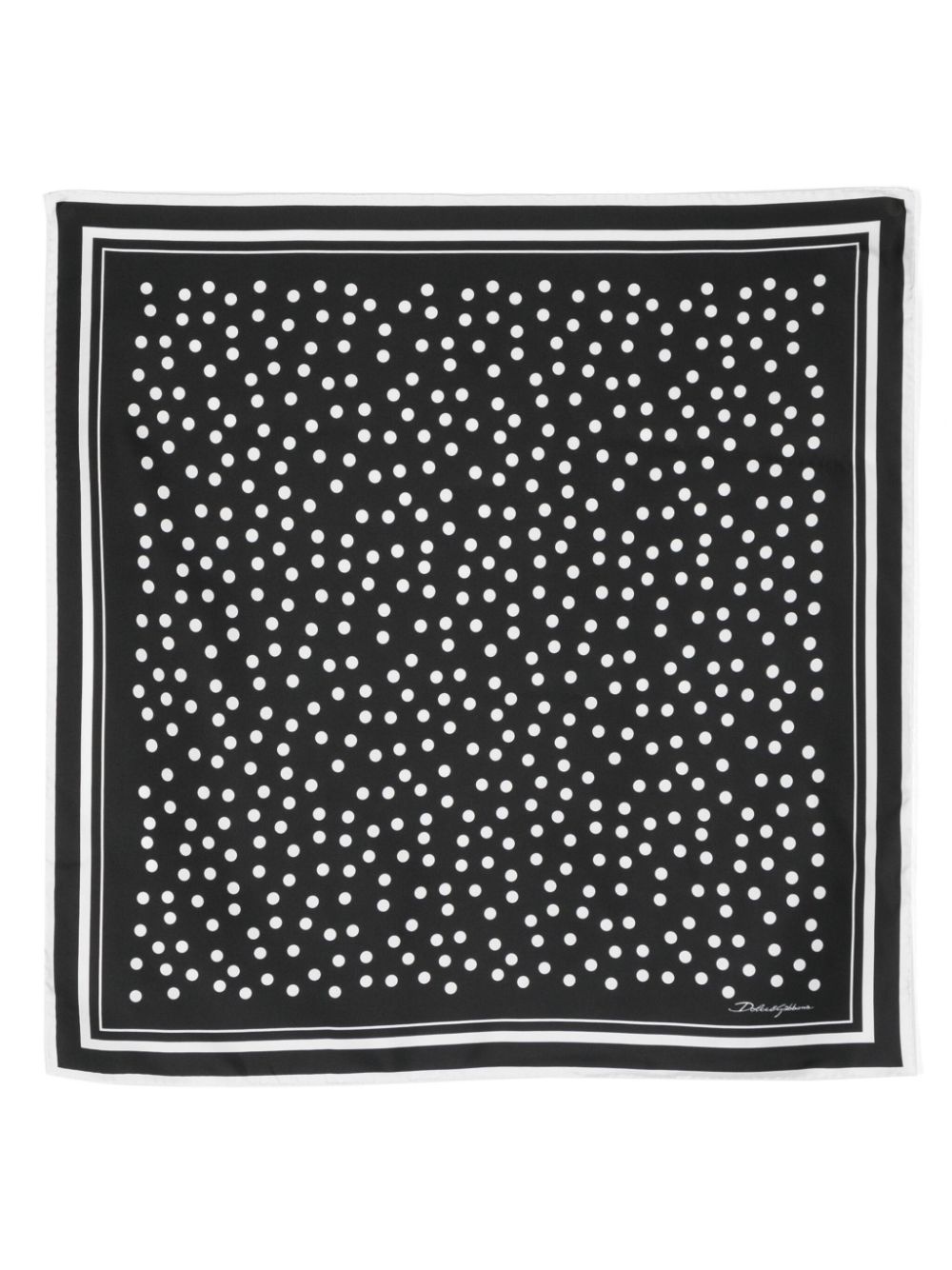 polka-dot silk scarf This scarf combines Dolce & Gabbana's love for refined materials and bold patterns. It's crafted from soft silk and decorated with a playful polka dot print. Highlights - Black/white - Silk - Polka dot print - Square shape - Contrasting border - Internal logo tag - Wraparound style Made in Italy Composition Silk 100% SIZE & FIT Measurement LENGTH 27.55 in(70 cm) WIDTH 27.55 in(70 cm)
