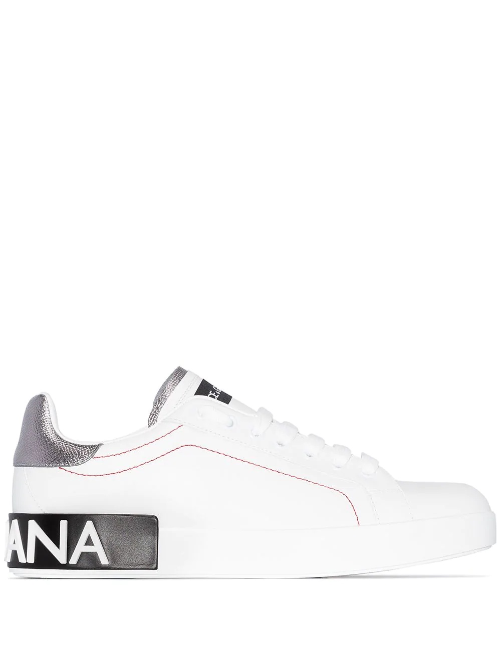 Portofino leather sneakers Highlights - White/silver-tone/red - Calf leather - Metallic-effect heel counter - Logo patch at the tongue - Embossed rubber logo to the rear - Contrast stitching - Round toe - Front lace-up fastening - Flat rubber sole Made in Italy Composition Calf Leather 100% SIZE & FIT Model measurements Height 5 ft 11 in(1.8 m) Bust/Chest 31.49 in(80 cm) Hips 37 in(94 cm) Waist 25.98 in(66 cm) FittingInformation This piece fits true to size. We recommend you get your regular size Measurement HEEL 1.37 in(3.5 cm) Sole height 0.98 in(2.5 cm)