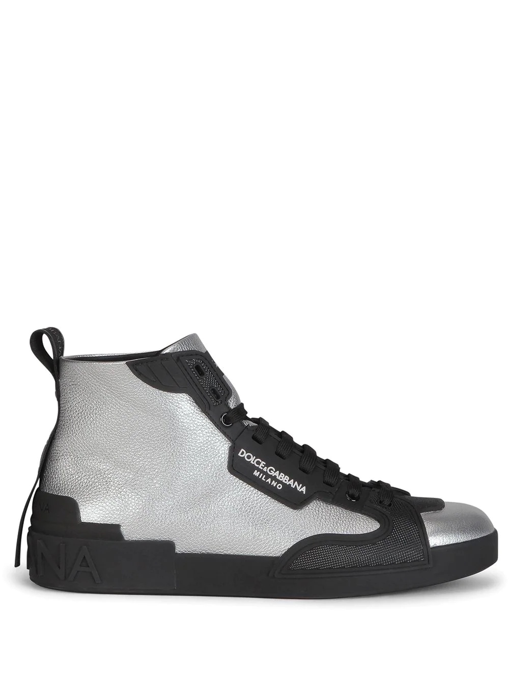 Portofino Light high-top sneakers The Portofino sneaker is a Dolce & Gabbana classic. Reimagined in a high-top silhouette, this striking silver-tone pair deserves a spot on your shoe rack. Put your best foot forward. Made in Italy Composition Outer: Calf Leather 100% Lining: Leather 100% Sole: Rubber 100% SIZE & FIT FittingInformation This piece fits small – take one size up