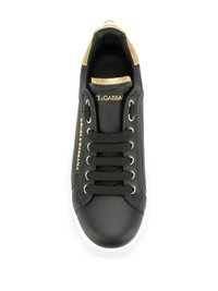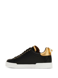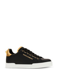 Portofino logo-tag leather sneakers Highlights - Dolce & gabbana update their signature portofino sneakers for spring summer 2018 with in a slick black with gold-tone accents. crafted from luxury italian calf leather, these sneakers feature a round toe, a lace fastening, a branded insole, a brand embossed tongue, a gold-tone logo plaque to the side, a flat rubber sole and are finished with a contrasting gold-tone heel counter with a logo plaque pearl embellishment. Made in Italy Composition Calf Leather 100% SIZE & FIT Measurement HEEL 0.98 in(2.5 cm) Sole height 0.78 in(2 cm)