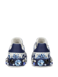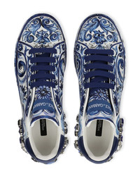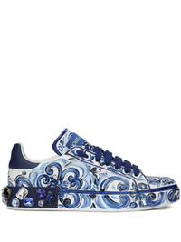 Portofino Majolica-print leather sneakers DOLCE & GABBANA updates the Portofino sneakers with its signature Majolica print — a motif that recalls the brand's Sicilian heritage. The pair is enhanced with gemstone embellishments and set on a flat rubber sole. Highlights - Blue/white - Calf leather - Majolica print - Gemstone detailing - Logo patch at the tongue - Branded leather insole - Round toe - Front lace-up fastening - Flat rubber sole Made in Italy Composition Leather 100%
