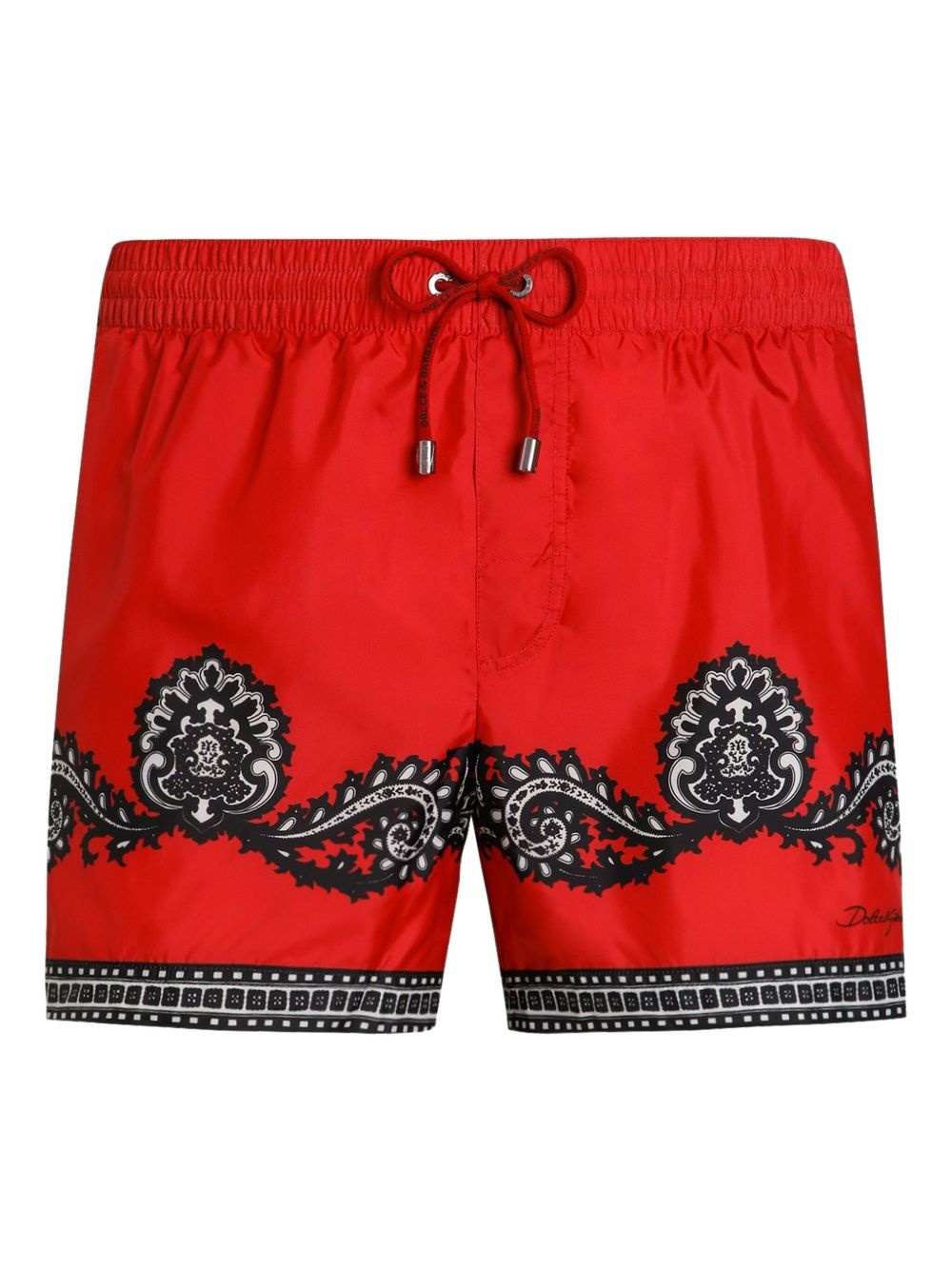 printed swim shorts Highlights - Red - Elasticated drawstring waistband - Rear zip-fastening pocket - Bandana print - Be mindful to try on swimwear over your own garments. Made in Italy Composition Lining: Polyester 100% Outer: Polyamide 88%, Spandex/Elastane 12%