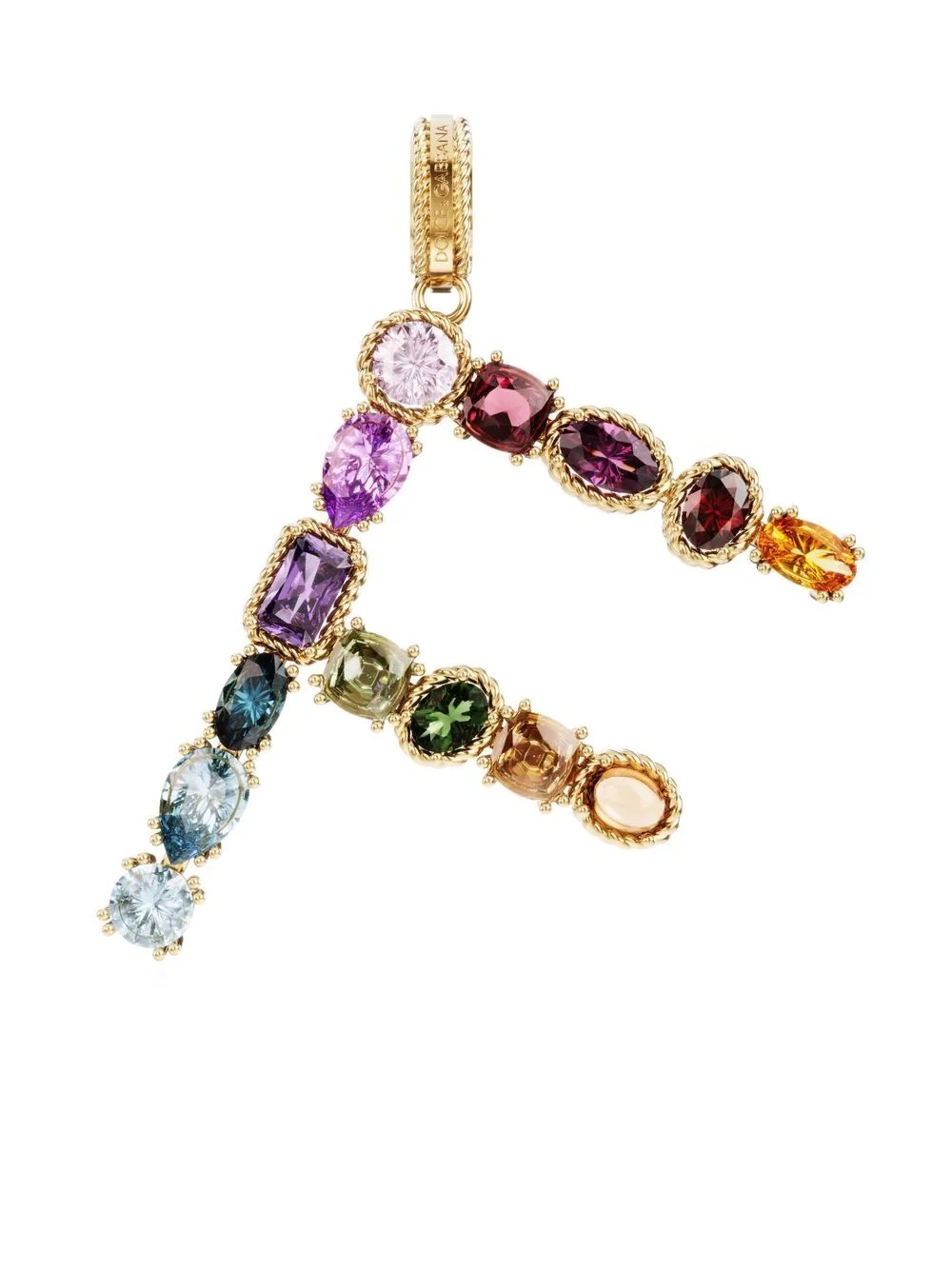 Rainbow Alphabet 18kt yellow gold multi-stone pendant Dolce & Gabbana's pendant offers a personalized approach to jewellery - it's part of the Alphabet line inspired by a fascination with the power of letters. This 18kt yellow gold piece depicts a 'F' initial and is set with colourful gemstones including peridot, tourmaline and quartz. Highlights - 18kt yellow gold - Engraved logo - Textured finish - Tourmaline - Amethyst - Quartz - Citrine - Garnet - Peridot - Topaz - Normal everyday use and external agents may reduce the lustre of gemstones and gold surfaces. to maintain, use specific, non-abrasive products specially meant for cleaning jewellery. Made in Italy Composition 18kt Yellow Gold 100%, Pink Tourmaline 100%, Amethyst 100%, Rhodolite 100%, quartz 100%, Citrine 100%, Garnet 100%, Tourmaline 100%, Peridot 100%, Blue Topaz 100%