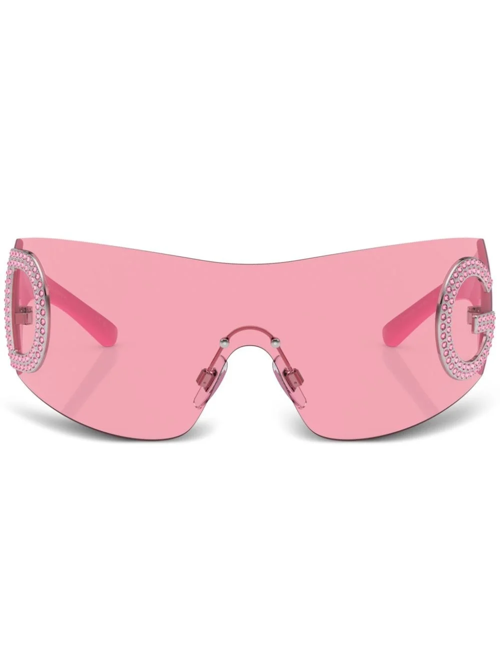 Re-Edition shield-frame sunglasses Dolce & Gabbana brings forth a sense of Y2K nostalgia with these sunglasses. Imagined in a bubblegum pink hue, they boast shield frames trimmed with a crystal-embellished 'DG' logo. Highlights - Pink - Metal - Shield frame - Pink tinted lenses - Crystal embellishment - Silver-tone logo plaque - Curved arms - These glasses come with a protective case. Made in United States Composition Metal 100%