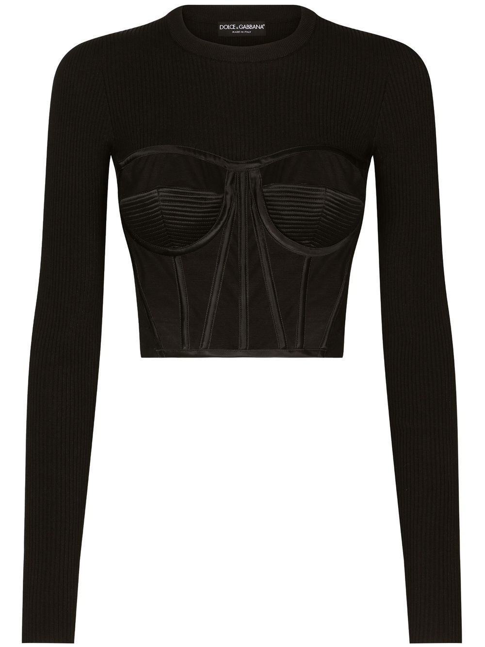 fine-rib bustier jumper The design of this ribbed knit top from Dolce & Gabbana nods to lingerie styles. An unexpected bustier is seen to the front, offering a modern take on knitwear. Made in Italy Composition Rayon 48%, Polyester 19%, Nylon 18%, Acetate 8%, Spandex/Elastane 7%