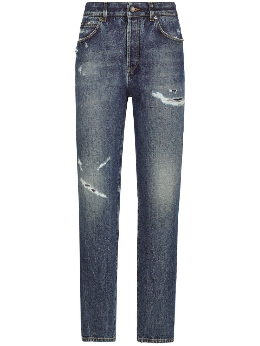 ripped-detail boyfriend-fit jeans Cut from rigid cotton denim in Italy to a slouchy boyfriend silhouette, these indigo-hued jeans from Dolce & Gabbana are punctuated with ripped and whiskering accents that lend the pair a worn-in flair. A metallic logo plaque adorns the rear. Highlights - Indigo blue - Cotton - Denim - Mid-rise - Belt loops - Concealed fly and button fastening - Classic five pockets - Ripped detailing - Whiskering effect - Boyfriend cut - Logo plaque Made in Italy Composition Cotton 100% Washing instructions Read Manufacturer Guidelines