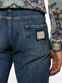 ripped-detail tapered jeans Highlights - Indigo blue - Stretch-cotton - Washed denim - Ripped detailing - Silver-tone logo plaque - Mid-rise - Belt loops - Front button and zip fastening - Classic five pockets - Tapered leg - Slim cut Made in Italy Composition Cotton 98%, Elastane 2% SIZE & FIT Model measurements Height 6 ft 2 in(1.87 m) Bust/Chest 36.22 in(92 cm) Hips 37 in(94 cm) Waist 27.95 in(71 cm) FittingInformation Designed for a slim fit, these jeans offer a comfortable fit that sits just away from the leg Constructed from stretch denim, this piece offers a stretch fit with durability This piece fits true to size – take your usual size
