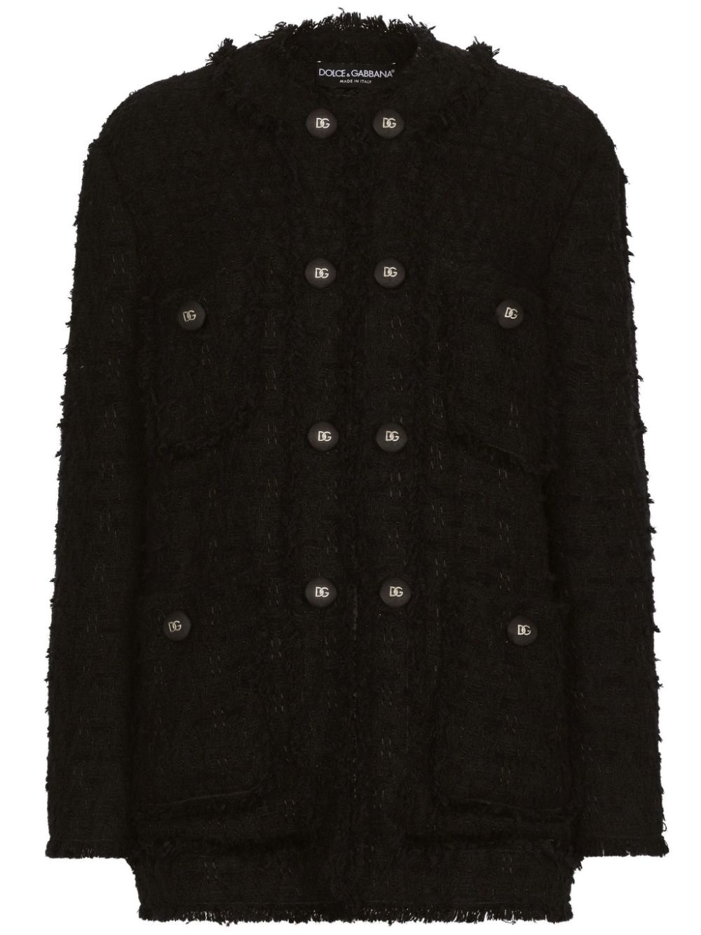 round-neck buttoned tweed jacket Highlights - Black - Cotton blend - Tweed - Logo-engraved buttons - Frayed detailing - Round neck - Front button fastening - Long sleeves - Four front patch pockets - Straight hem Made in Italy Composition Cotton 67%, Viscose 28%, Linen/Flax 4%, Polyamide 1%