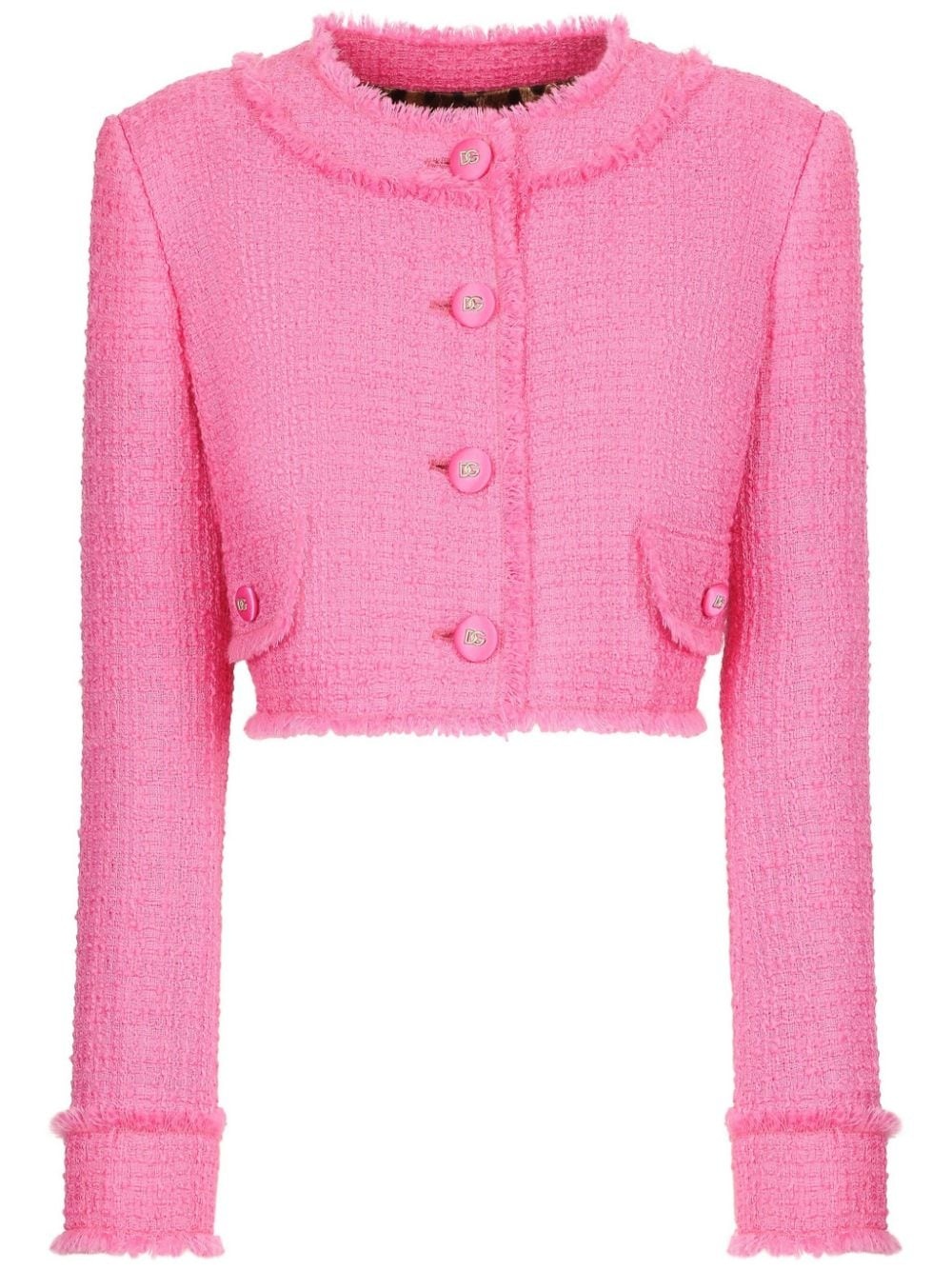 round-neck cropped tweed jacket Highlights - Fuchsia pink - Wool blend - Tweed - Frayed detailing - Cropped - Logo-engraved buttons - Round neck - Front button fastening - Long sleeves - Buttoned cuffs - Two front flap pockets - Straight hem Made in Italy Composition Wool 93%, Polyamide 7% SIZE & FIT Measurement SLEEVE LENGTH 23.62 in(60 cm) LENGTH 17.32 in(44 cm) WAIST 34.64 in(88 cm) Washing instructions Read Manufacturer Guidelines