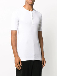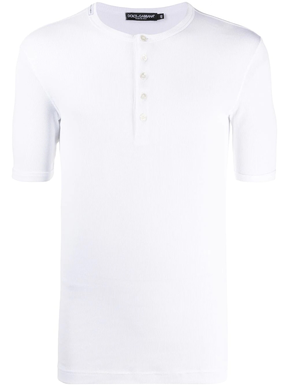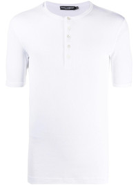 fine-rib cotton T-shirt Basics are everything. In a white hue and punctuated by a round neck, this Dolce & Gabbana polo shirt is here to make your life easier. The possibilities are endless. Highlights - White - Cotton - Round neck - Front button placket - Short sleeves - Straight hem Made in Italy Composition Cotton 100% SIZE & FIT Model measurements Height 6 ft 2 in(1.87 m) Bust/Chest 38.18 in(97 cm) Hips 36.61 in(93 cm) Waist 29.13 in(74 cm) FittingInformation This piece fits true to size. We recommend you get your regular size Cut for a slim fit Made with a mid-weight fabric Washing instructions Machine Wash
