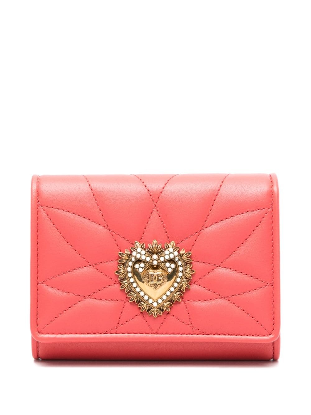 Sacred Heart-plaque wallet Highlights - Coral red - Calf leather - Quilted - Foldover top with press-stud fastening - Rectangle body - Signature sacred heart plaque - Internal card slots - Internal flap pocket - Internal note compartments - Gold-tone hardware - This piece comes complete with a protective dust bag. Made in Italy Composition Outer: Calf Leather 100% SIZE & FIT Measurement DEPTH 0.78 in(2 cm) LENGTH 4.33 in(11 cm) WIDTH 3.54 in(9 cm)