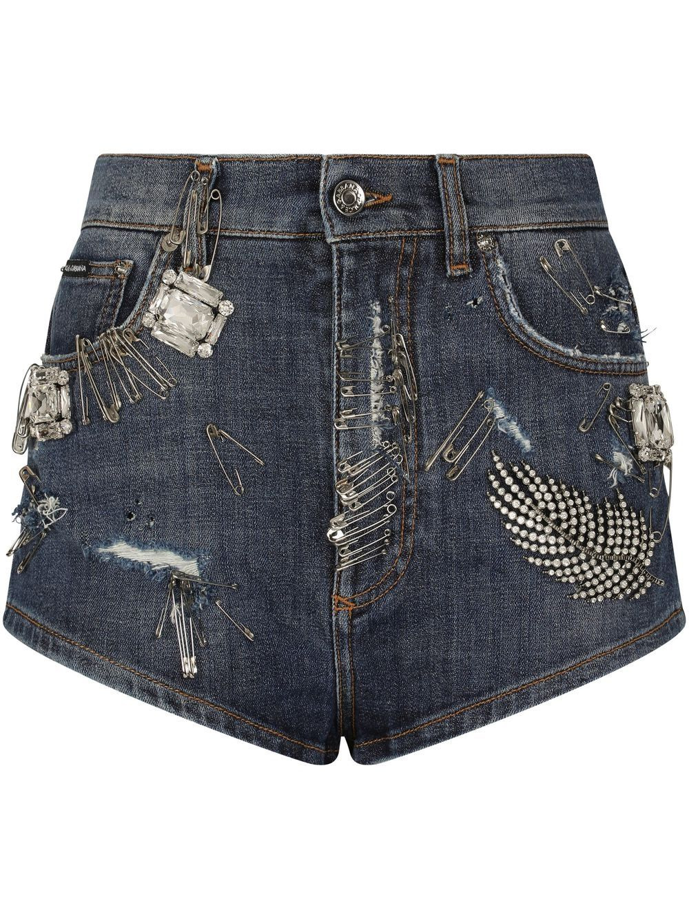 rhinestone-embellished denim shorts Highlights - Indigo blue - Stretch-cotton - Safety pin detail - Sequin embellishment - High waist - Belt loops - Concealed front fastening - Classic five pockets Made in Italy Composition Cotton 99%, Spandex/Elastane 1%