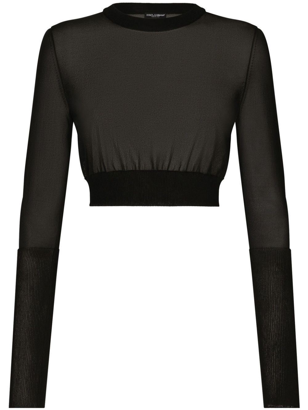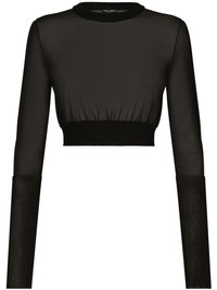 semi-sheer cropped top Highlights - Black - Semi-sheer construction - Round neck - Long sleeves - Ribbed cuffs and hem - Cropped Made in Italy Composition Rayon 80%, Nylon 20% SIZE & FIT FittingInformation Designed for a slim fit that sits just away from the body offering a close yet comfortable fit