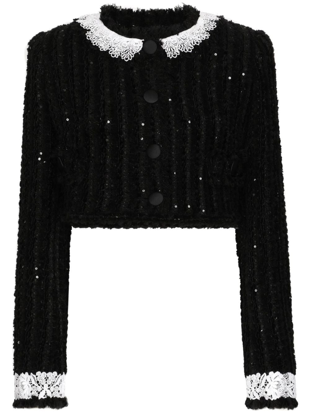 sequin-embellished cropped jacket Highlights - Black - Wool blend - Boucle construction - Sequin embellishment - Lace trim - Round neck - Front button fastening - Fabric-covered buttons - Long sleeves - Cropped - Straight hem Made in Italy Composition Outer: Wool 60%, Polyamide 15%, Acrylic 10%, Polyester 5% Lining: Silk 92%, Spandex/Elastane 8% Washing instructions Read Manufacturer Guidelines