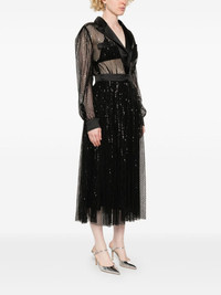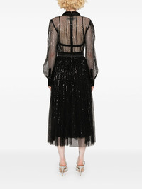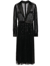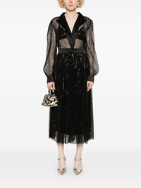 sequin-embellished midi dress Highlights - Black - Mesh design - Sequin embellishment - Satin trim - Semi-sheer construction - Concealed rear zip fastening - V-neck - Long sleeves with buttoned cuffs - Two faux chest welt pockets - Pleated skirt - Belted waist with rear press-stud fastening - Partial silk lining - Mid-length - Flared hem Made in Italy Composition Outer: Polyamide 80%, Silk 18%, Polyester 2% Lining: Silk 91%, Spandex/Elastane 9% SIZE & FIT Model measurements Height 5 ft 9 in(1.75 m) Bust/Chest 34.64 in(88 cm) Hips 36.61 in(93 cm) Waist 26.37 in(67 cm) FittingInformation Made from a midweight fabric