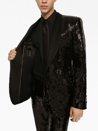 sequin-embellished suit Dolce & Gabbana updates the classic single-breasted suit for AW23 with bold sequin embellished detailing. Crafted from a silk blend, this design boasts a straight cut. Highlights - Black - Silk blend - Sequin embellishment - Front button fastening - Buttoned cuffs - Long sleeves - Chest welt pocket - Two front flap pockets - Straight leg - Two side slit pockets Made in Italy Composition Silk 92%, Elastane 8%