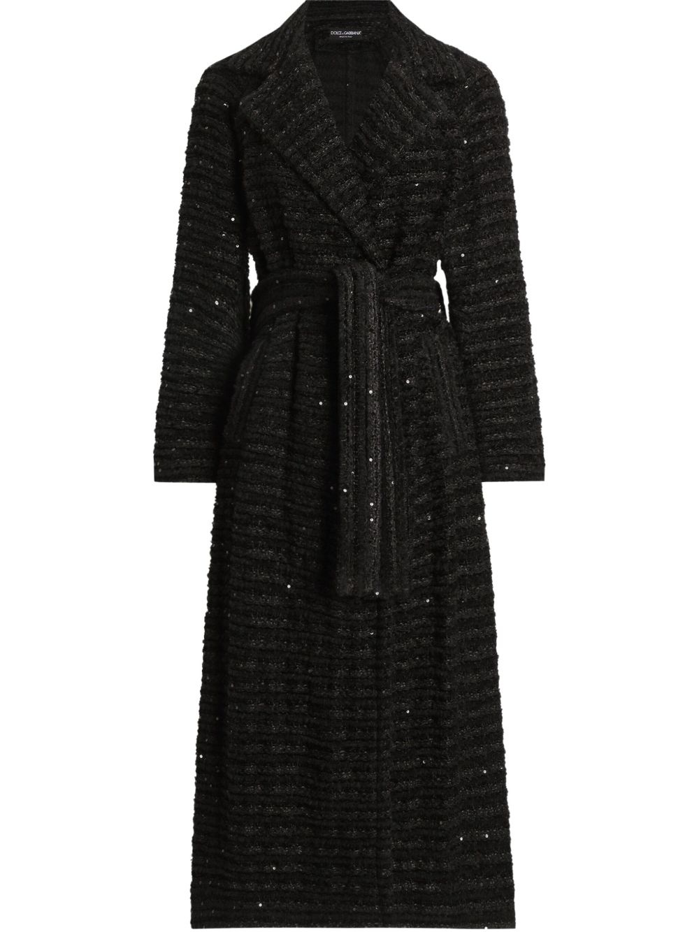 sequin-embellished tweed coat Highlights - Black - Detachable and adjustable waist belt - Two side welt pockets - Notched lapels - Straight hem Made in Italy Composition Outer: Viscose 32%, Polyester 25%, Wool 14%, Acrylic 14%, Cotton 10%, Polyamide 4%, Other fibres 1% Lining: Polyamide 100%