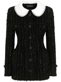 sequinned tweed jacket Highlights - Black - Tweed - Sequin embellishment - Large peter pan collar - Front button fastening - Long sleeves - Two button-fastening chest pockets - Two front patch pockets - Frayed hem Made in Italy Composition Cotton 25%, Polyester 22%, Viscose 21%, Virgin Wool 10%, Polyamide 9%, Silk 8%, Acrylic 5% Washing instructions Read Manufacturer Guidelines