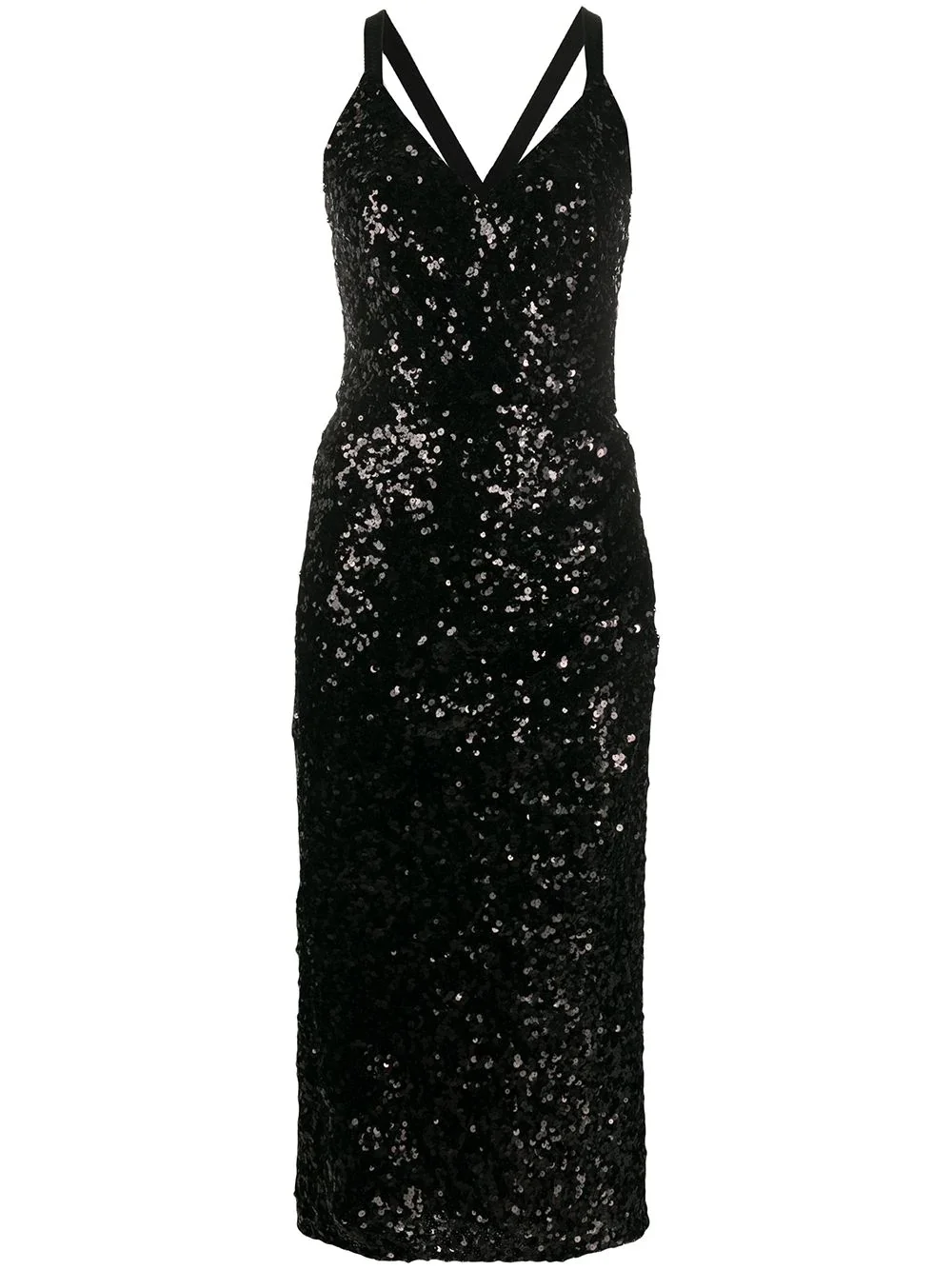 sequinned V-neck midi dress Highlights - Black - Sequinned - V-neck - Sleeveless - Back criss cross straps - Straight fit - Mid-length Made in Italy Composition Lining: Silk 92%, Spandex/Elastane 8% Outer: Polyamide 94%, Spandex/Elastane 6% Washing instructions Dry Clean Only