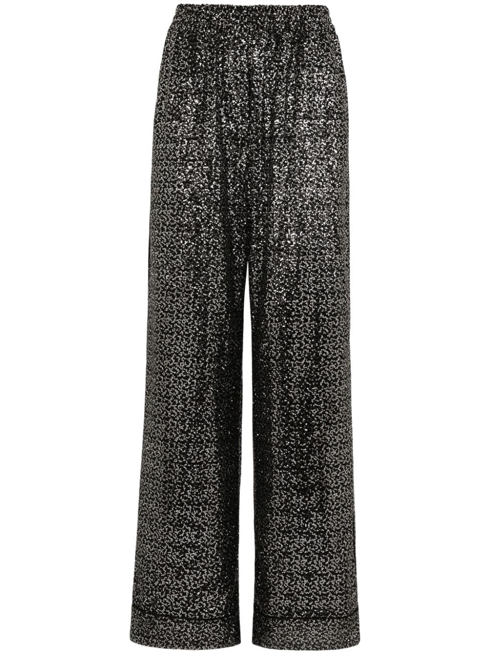 sequinned wide-leg trousers 'Women', the SS24 collection by Dolce & Gabbana, celebrates 'femininity and sensuality' with predominantly black looks. As part of that edit, these trousers are adorned with shimmering sequins that reflect the glamorous style of the house. Highlights - Black/grey - Sequin design - Contrasting trim - Elasticated waistband - High-waisted - Wide leg Imported Composition Polyester 95%, Silk 5% SIZE & FIT Measurement FRONT RISE 12.59 in(32 cm) INSIDE LEG 29.52 in(75 cm) HIPS 38.58 in(98 cm) WAIST 22.83 in(58 cm) Washing instructions Read Manufacturer Guidelines