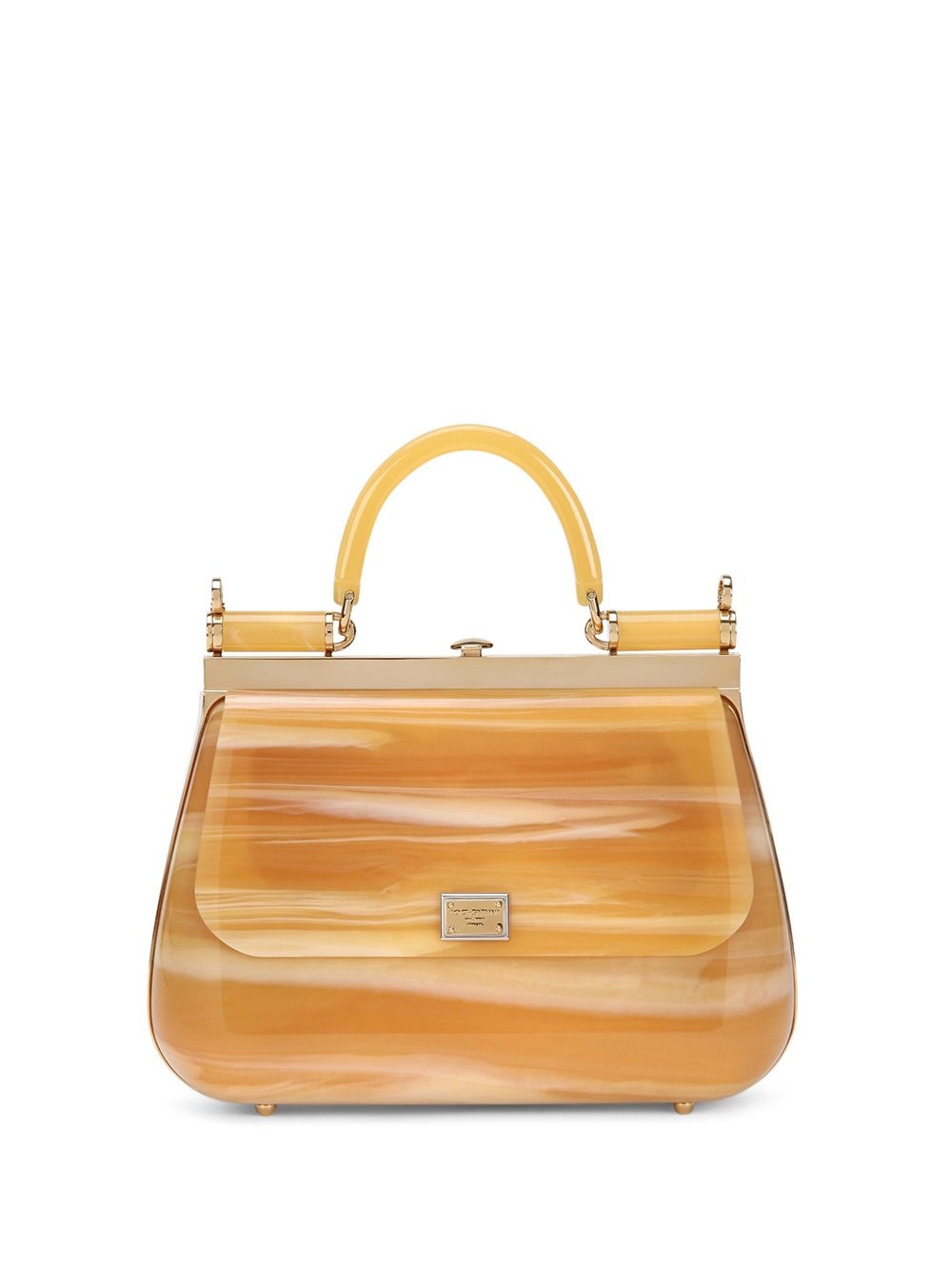Sicily box bag You're looking at your new favourite bag. Designed with an eye-catching marble effect, Dolce & Gabbana's Sicily Box in acrylic glass is certainly no run-of-the-mill style. The best things really do come in small packages. Highlights - Amber orange - Acrylic glass - Marbled pattern - Gold-tone hardware - Logo plaque - Detachable chain-link shoulder strap - Single rolled top handle - Top clasp fastening - Main compartment - Internal logo plaque - Nappa leather lining - Metal feet Made in Italy Composition Outer: Polymethyl Methacrylate 50%, Aluminium 35%, Brass 15%
