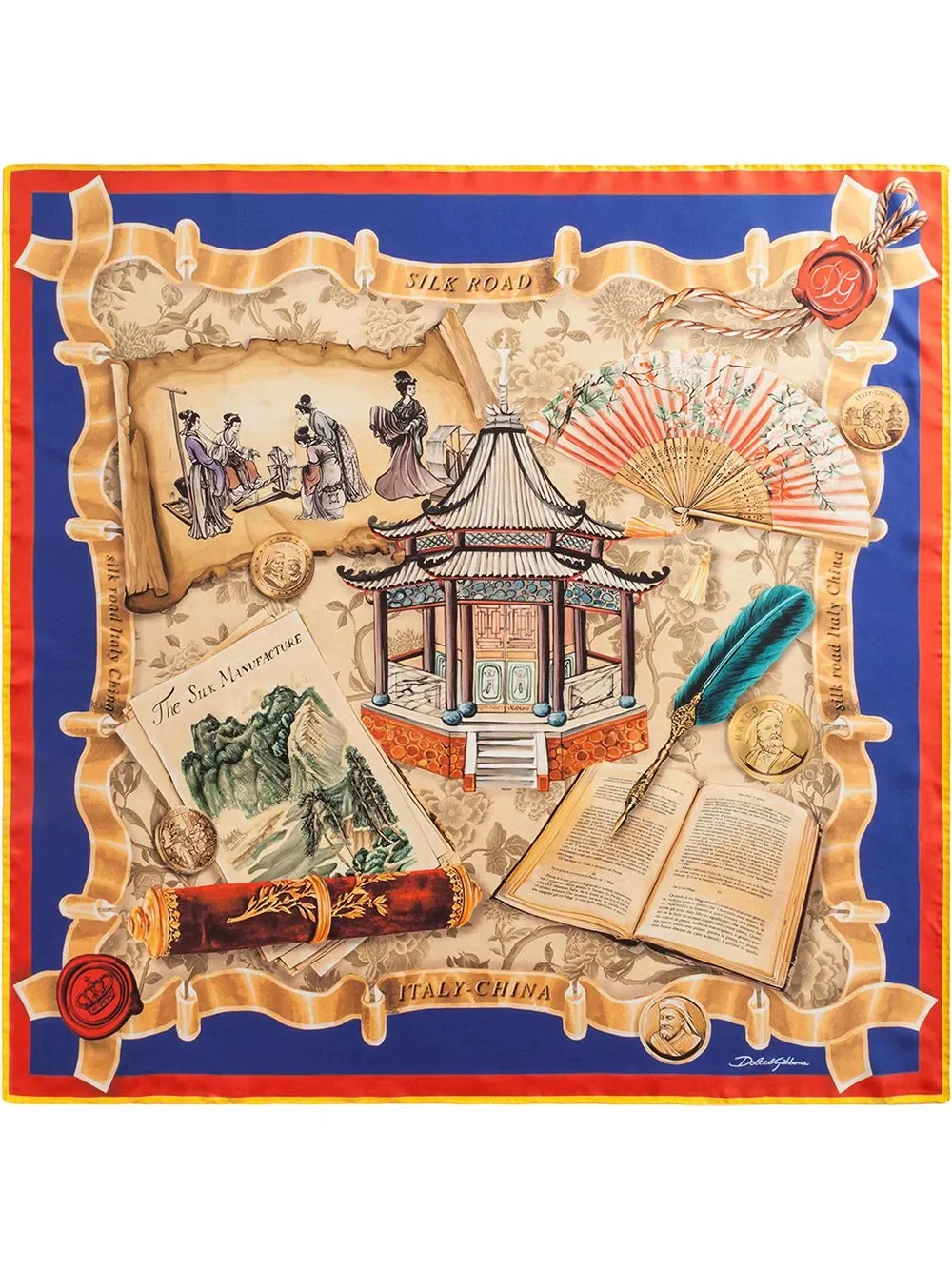 Silk Road-print silk-twill scarf Dolce & Gabbana's scarf isn't just any accessory. Cut from lightweight silk-twill, it's decorated with ornate prints depicting Marco Polo's travels along the historic Silk Road. Show it off in all its glory. Made in Italy Composition Silk 100% SIZE & FIT Measurement LENGTH 35.43 in(90 cm) WIDTH 35.43 in(90 cm)