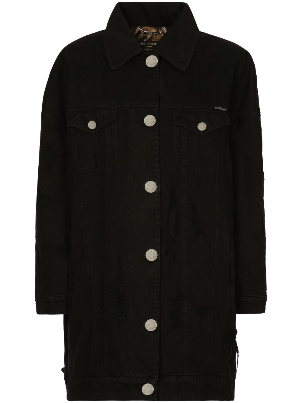 longline denim jacket Highlights - Black - Stretch-cotton - Denim - Silver-tone logo plaque - Classic collar - Front button fastening - Long sleeves - Two chest flap pockets Made in Italy Composition Cotton 98%, Elastane 2%