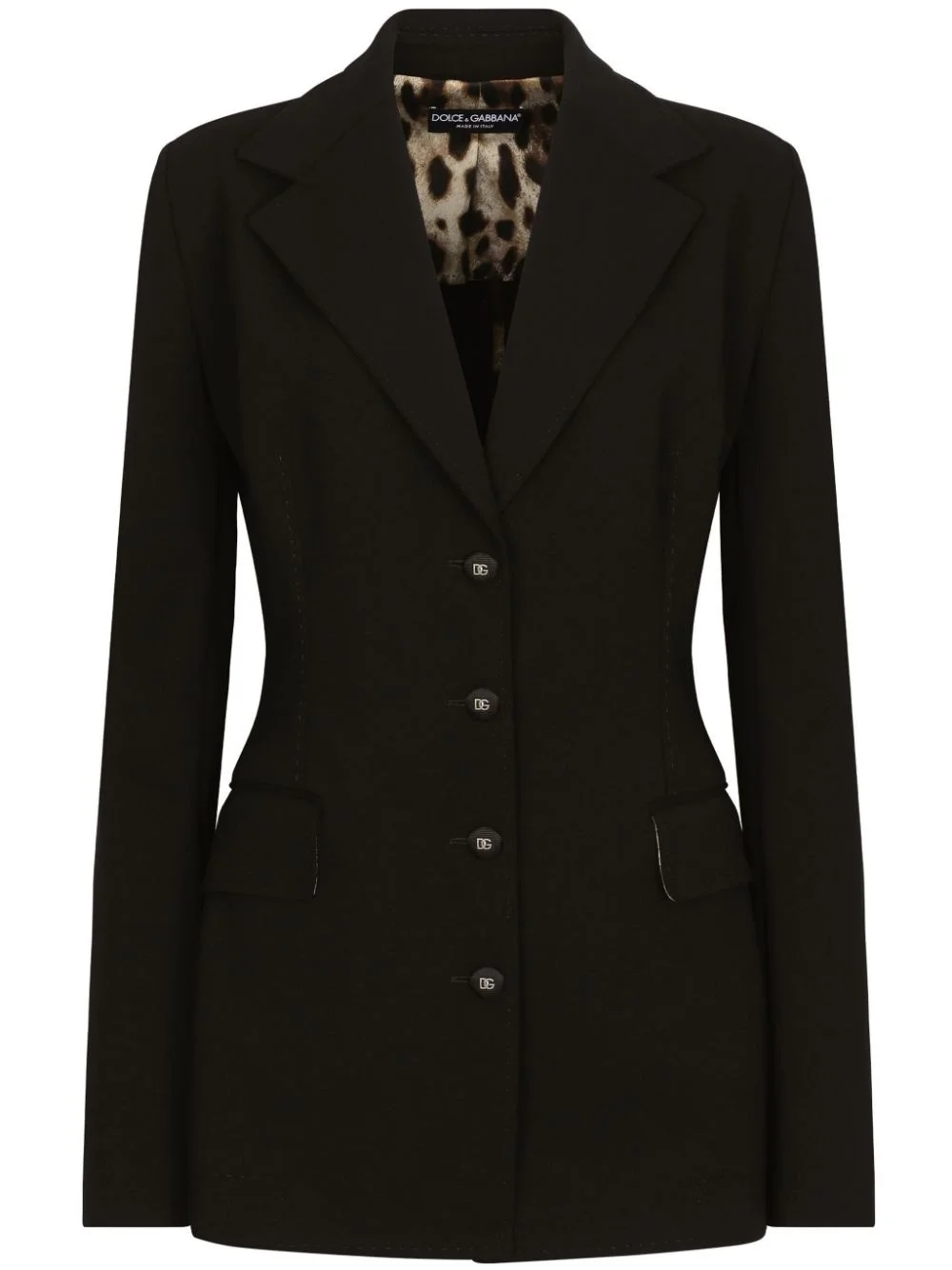 single-breasted fitted-waistline blazer Highlights - Black - Stretch-design - Fitted waistline - Logo-engraved buttons - Notched lapels - Front button fastening - Long sleeves - Buttoned cuffs - Two front flap pockets - Straight hem Made in Italy Composition Viscose 65%, Polyamide 27%, Elastane 4%, Silk 3%, Polyester 1% Washing instructions Read Manufacturer Guidelines