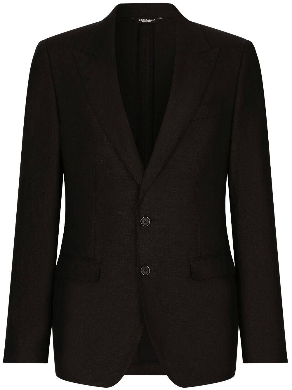 single-breasted linen blazer As part of the Dolce & Gabbana AW23 collection, this black blazer is tailored with a single-breasted button fastening and peak lapels for a sharp finish. Its linen construction lends itself to casual occasions. Highlights - Black - Linen - Peak lapels - Chest welt pocket - Front button fastening - Two side flap pockets - Long sleeves - Buttoned cuffs - Central rear vent - Straight hem - Cotton lining Made in Italy Composition Lining: Cotton 100% Outer: Flax 100%